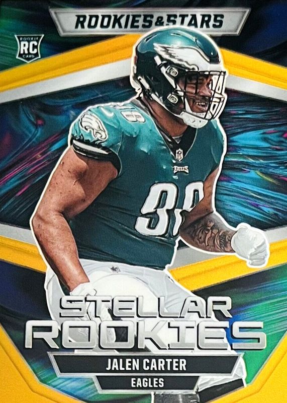 The Jalen Carter 2023 Rookies & Stars #SR-8 Stellar Rookies - Gold /10 card in Raw condition has not changed in price in the last 30 days and was last sold for $34.00 .