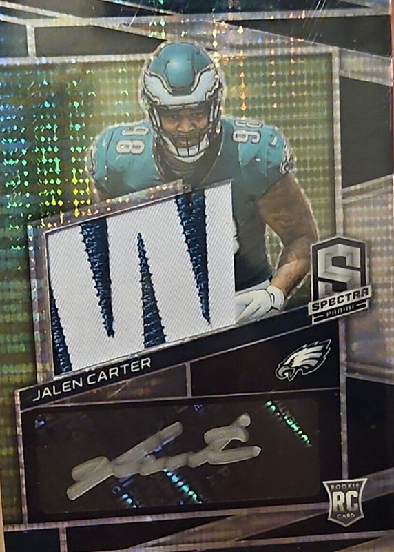 This card is 1 of 19 Jalen Carter's card variations in the 2023 Spectra set being tracked by Sports Card Investor, including Rookie Patch Auto /99, Rookie Patch Auto - Celestial /75, Rookie Patch Auto - Supernova /70, Rookie Patch Auto - Hyper /60, and Rookie Patch Auto - Neon Blue /50.