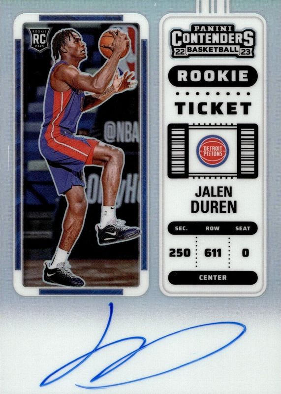 This card is 1 of 27 Jalen Duren's card variations in the 2022 Contenders set being tracked by Sports Card Investor, including Rookie Ticket Auto, Rookie Ticket Auto - Premium Green Shimmer, Rookie Ticket Auto - Ticket Stub (/1), Rookie Ticket Auto Variation, and Rookie Ticket Auto Variation - Premium.
