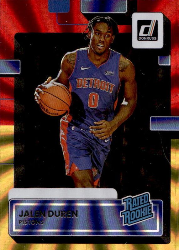 The Jalen Duren 2022 Donruss #213 Holo Red & Gold Laser Rookie card in Raw condition has not changed in price in the last 30 days and was last sold for $14.99 .