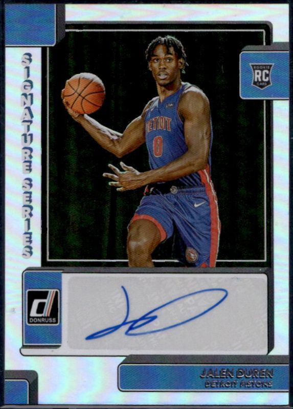 The Jalen Duren 2022 Donruss #SS-JDU Signature Series Rookie card is 1 of 49 Jalen Duren's card variations in the 2022 Donruss set being tracked by Sports Card Investor, including Base, Choice, Holo Green Laser, Holo Red & Gold Laser, and Press Proof Silver.