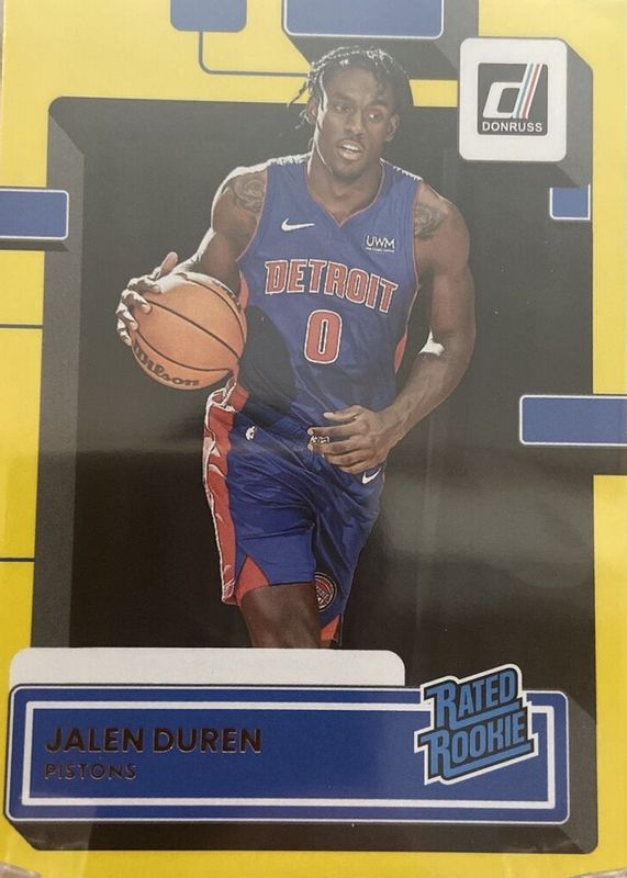 The Jalen Duren 2022 Donruss #213 Yellow Flood Rookie card in Raw condition has not changed in price in the last 30 days and was last sold for $0.99 .