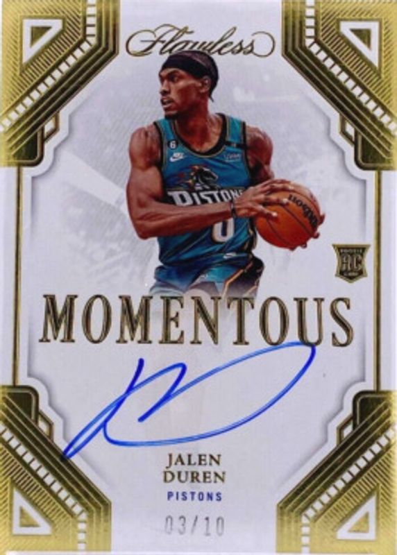 The Jalen Duren 2022 Flawless #MA-JDR Momentous Autographs - Gold /10 Rookie card in Raw condition has not changed in price in the last 30 days and was last sold for $221.00 .