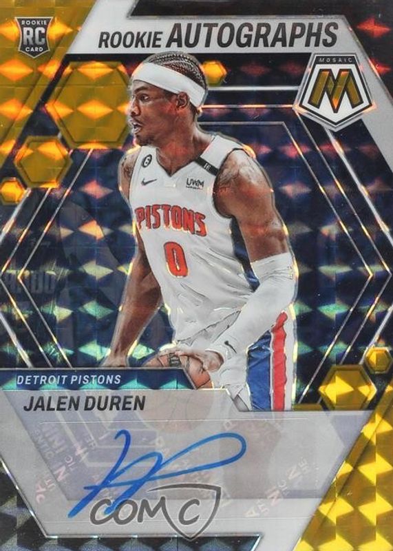 The Jalen Duren 2022 Mosaic #RA-DUR Rookie Autographs - Gold /10 card in Raw condition has not changed in price in the last 30 days and was last sold for $100.00 .