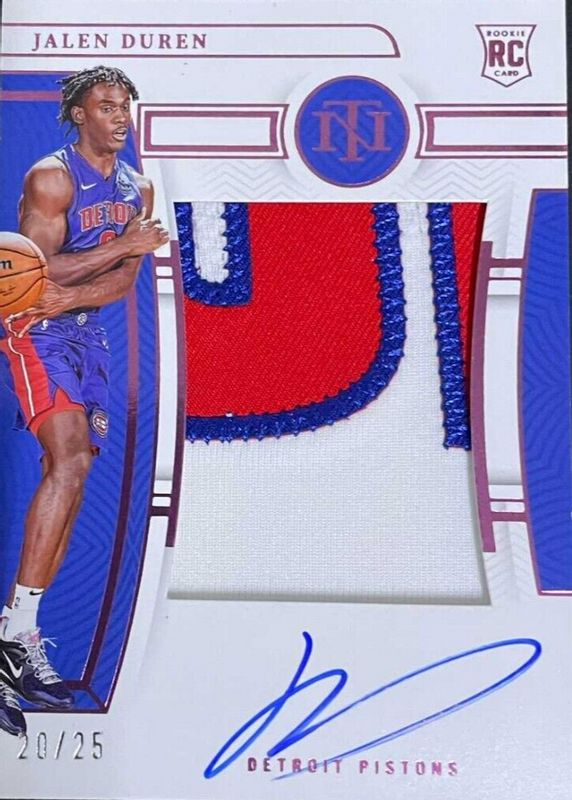 This card is 1 of 10 Jalen Duren's card variations in the 2022 National Treasures set being tracked by Sports Card Investor, including Rookie Patch Auto /99, Rookie Patch Auto - Red /75, Rookie Patch Auto - Bronze /49, Rookie Patch Auto - Gold FOTL /24, and Rookie Patch Auto - Gold /10.