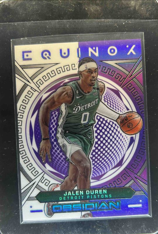 The Jalen Duren 2022 Obsidian #39 Equinox - Electric Etch Purple Flood /49 Rookie card is 1 of 54 Jalen Duren's card variations in the 2022 Obsidian set being tracked by Sports Card Investor, including Electric Etch Asia, Electric Etch Neon Flood, Electric Etch Red Flood, Electric Etch White Pulsar, and Electric Etch Purple /75.