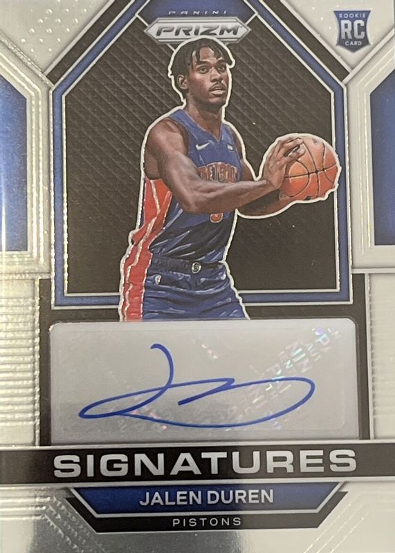 The Jalen Duren 2022 Prizm #RSI-JDU Rookie Signatures card in Raw condition has not changed in price in the last 30 days and was last sold for $49.98 .