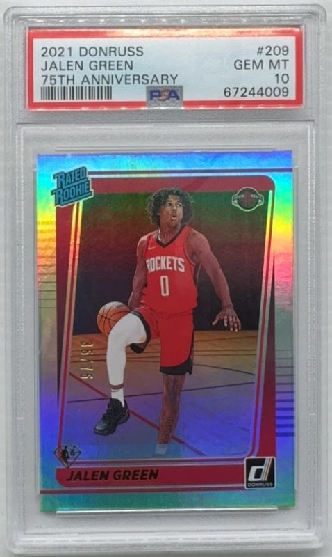 The Jalen Green 2021 Donruss #209 75th Anniversary /75 Rookie card is 1 of 68 Jalen Green's card variations in the 2021 Donruss set being tracked by Sports Card Investor, including Base, Choice, Green Ice, Green Laser, and Green & Yellow Laser.