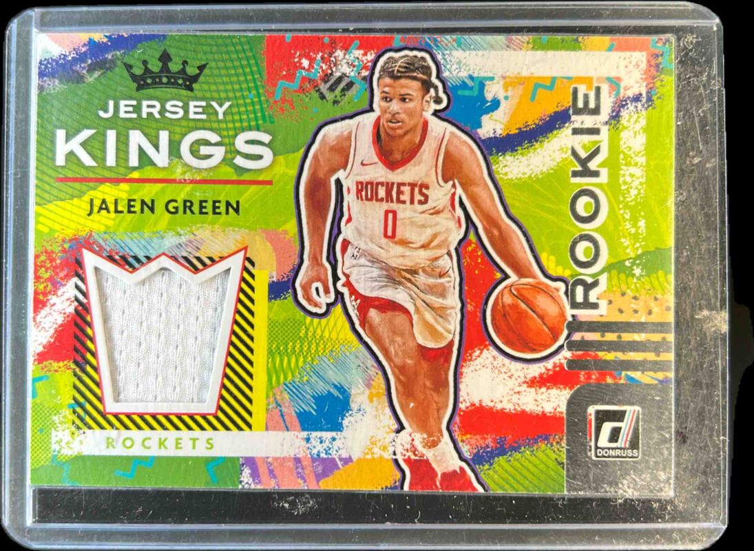 The Jalen Green 2021 Donruss #RJ-JGR Rookie Jersey Kings card is 1 of 68 Jalen Green's card variations in the 2021 Donruss set being tracked by Sports Card Investor, including Base, Choice, Green Ice, Green Laser, and Green & Yellow Laser.