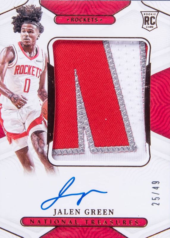 This card is 1 of 10 Jalen Green's card variations in the 2021 National Treasures set being tracked by Sports Card Investor, including Rookie Patch Auto - NBA 75th (/75), Rookie Patch Auto - Pink (/25), Rookie Patch Auto /99, Rookie Patch Auto - Gold FOTL /24, and Rookie Patch Auto - Gold /10.
