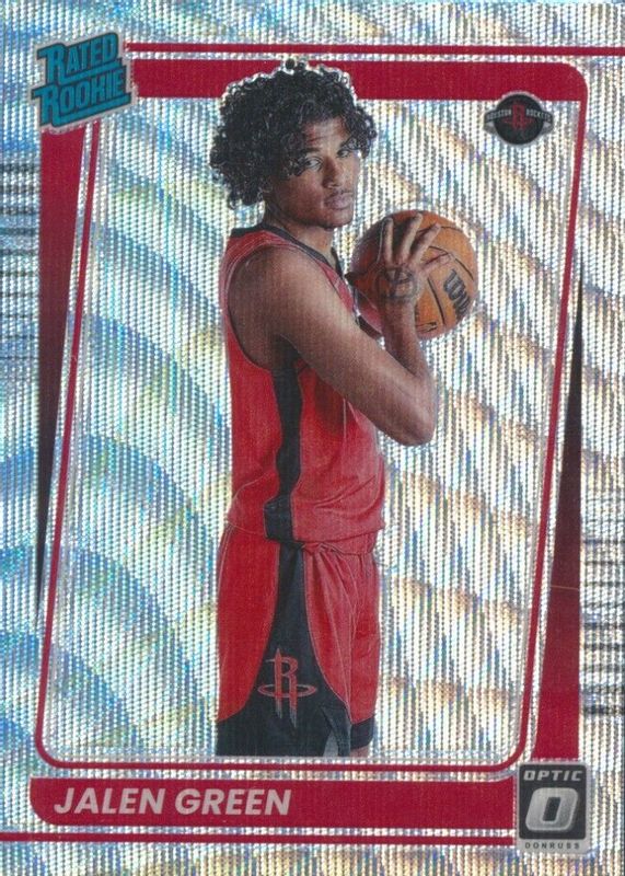 This card is 1 of 106 Jalen Green's card variations in the 2021 Optic set being tracked by Sports Card Investor, including Base, Blue Pulsar, Blue Velocity, Checkerboard, and Choice.