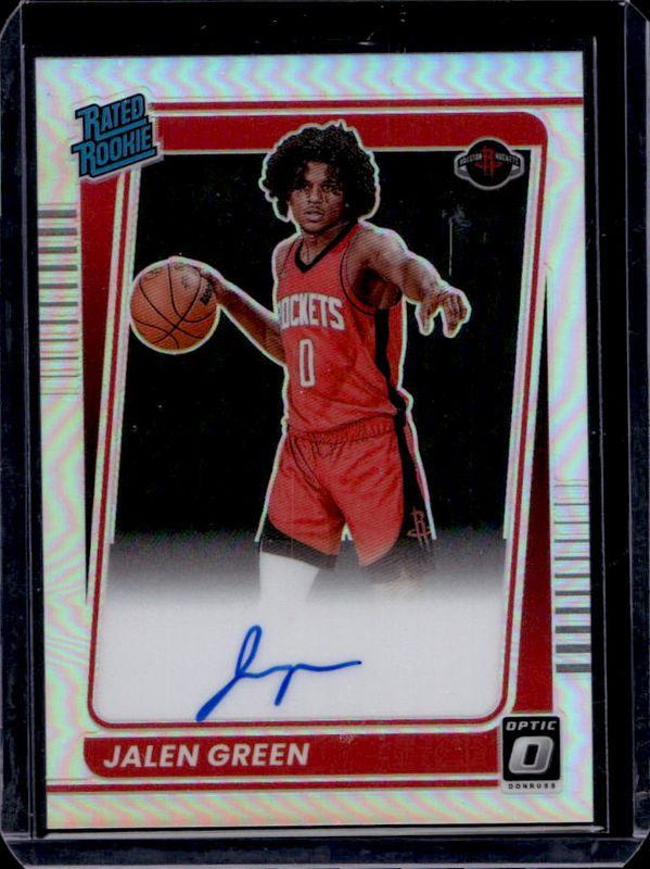 The Jalen Green 2021 Optic #159 Rated Rookie Signatures - Holo card is 1 of 106 Jalen Green's card variations in the 2021 Optic set being tracked by Sports Card Investor, including Base, Blue Pulsar, Blue Velocity, Checkerboard, and Choice.