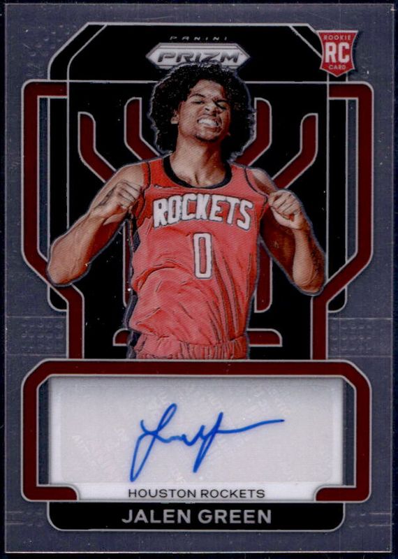 The Jalen Green 2021 Prizm #RS-JGR Rookie Signatures card is 1 of 103 Jalen Green's card variations in the 2021 Prizm set being tracked by Sports Card Investor, including #306b Base, #306 Base, #306 Photo Variation, #306 Blue NBA 75th Anniversary, and #306 Blue Wave.