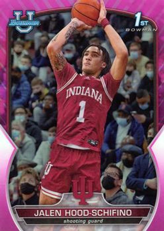 The Jalen Hood-Schifino 2022 Bowman Chrome University #57 Pink Refractor card is 1 of 37 Jalen Hood-Schifino's card variations in the 2022 Bowman Chrome University set being tracked by Sports Card Investor, including Base, Purple Shimmer Refractor, Refractor, Shimmer Refractor, and Purple Mini-Diamond Refractor /399.