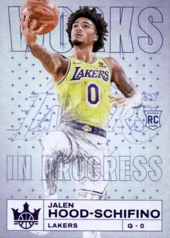 The Jalen Hood-Schifino 2023 Court Kings #5 Works in Progress - Violet /49 Rookie card in Raw condition has not changed in price in the last 30 days and was last sold for $2.25 .