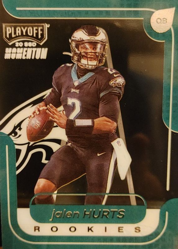 The Jalen Hurts 2020 Chronicles #M-18 Playoff Momentum Rookie card in Raw condition has moved down -$1.01 (-50.5%) in the last 30 days and was last sold for $0.99 .