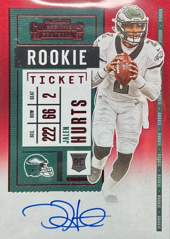 This card is 1 of 19 Jalen Hurts' card variations in the 2020 Contenders set being tracked by Sports Card Investor, including Rookie Ticket Auto, Rookie Ticket Auto Variation, Rookie Ticket Auto - Red Zone Ticket, Rookie Ticket Auto - Ticket Stub (/2), and Rookie Ticket Auto Variation - Ticket Stub (/2).