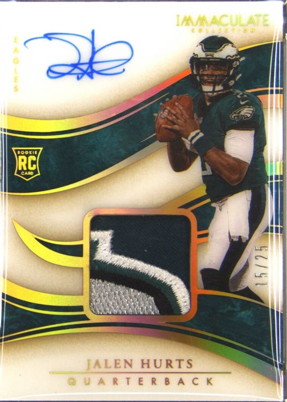 This card is 1 of 26 Jalen Hurts' card variations in the 2020 Immaculate set being tracked by Sports Card Investor, including Immaculate Introductions Autographs (/25), Immaculate Numbers Rookie Patch Autographs (/2), Immaculate Rookie Eye Black Jersey Autographs (/99), Immaculate Rookie Shadowbox Signatures (/57), and Immaculate Rookie Signature Patches (/99).