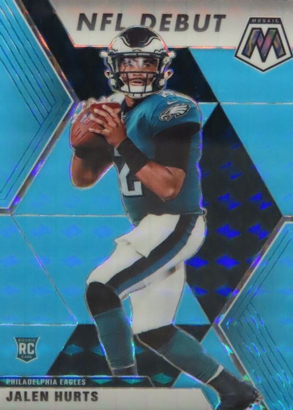 The Jalen Hurts 2020 Mosaic #265 NFL Debut - Blue Fluorescent /15 Rookie card in Raw condition has not changed in price in the last 30 days and was last sold for $177.50 .