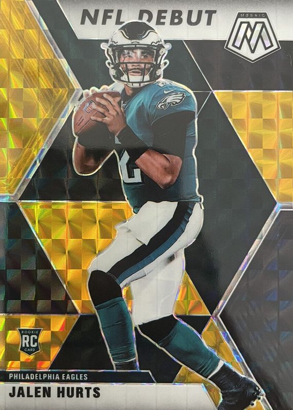 The Jalen Hurts 2020 Mosaic #265 NFL Debut - Choice Black & Gold /8 Rookie card in Raw condition has not changed in price in the last 30 days and was last sold for $435.00 .
