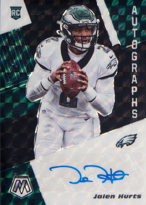 This card is 1 of 77 Jalen Hurts' card variations in the 2020 Mosaic set being tracked by Sports Card Investor, including Base, NFL Debut, Choice Red & Green, Green, and NFL Debut - Choice Red & Green.