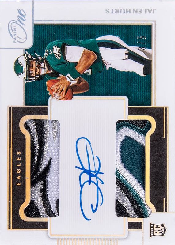 The Jalen Hurts 2020 One #44 Rookie Dual Patch Auto - Platinum /5 card in Raw condition has not changed in price in the last 30 days and was last sold for $1,600.00 .