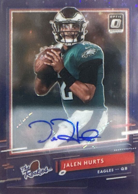 The Jalen Hurts 2020 Optic #TR-JAH The Rookies Autographs - Purple Stars /25 card in Raw condition has not changed in price in the last 30 days and was last sold for $400.00 .
