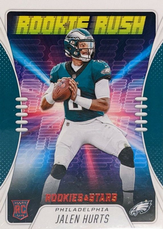 The Jalen Hurts 2020 Rookies & Stars #RR-5 Rookie Rush card in Raw condition has moved down -$0.51 (-25.5%) in the last 30 days and was last sold for $1.49 .