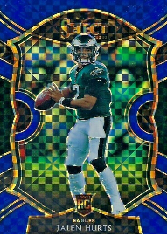 The Jalen Hurts 2020 Select #50 Concourse Blue /175 Rookie card in Raw condition has moved down -$7.95 (-13.7%) in the last 30 days and was last sold for $50.00 .