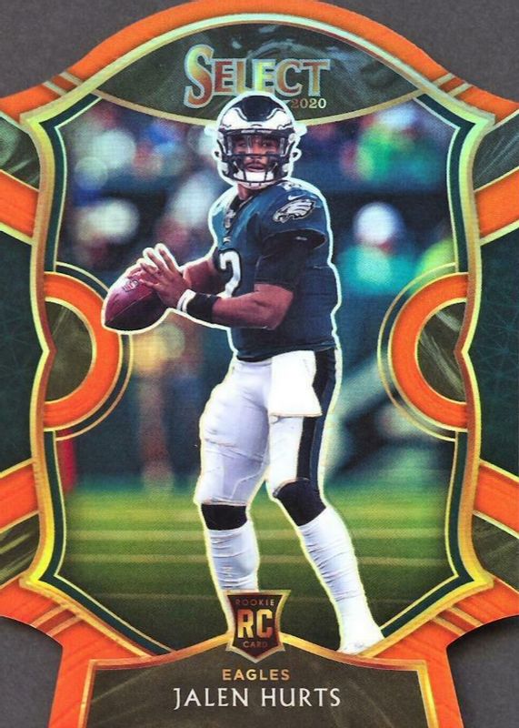 The Jalen Hurts 2020 Select #50 Concourse Orange Die-Cut Rookie card in Raw condition has moved up $0.50 (+9.1%) in the last 30 days and was last sold for $6.00 .
