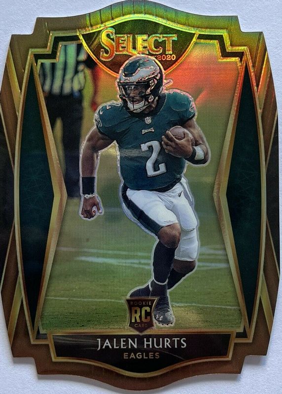 The Jalen Hurts 2020 Select #150 Premier Level Copper Die-Cut /355 Rookie card in Raw condition has moved down -$7.28 (-19.5%) in the last 30 days and was last sold for $30.00 .