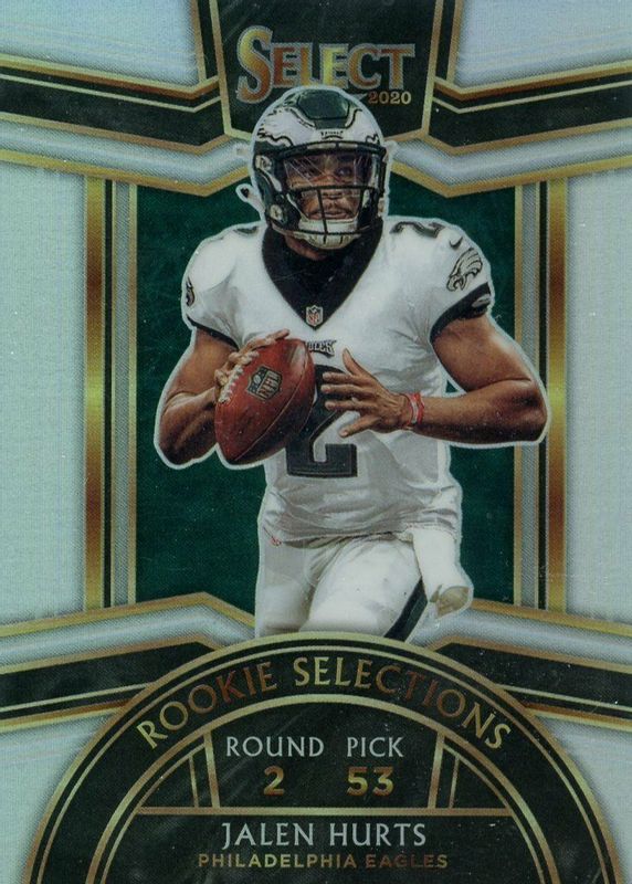 The Jalen Hurts 2020 Select #19 Rookie Selections - Silver card in Raw condition has moved up $18.79 (+179%) in the last 30 days and was last sold for $29.29 .