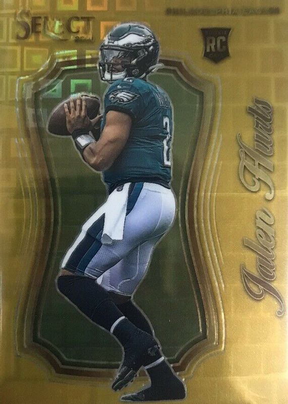 The Jalen Hurts 2020 Select #22 Select Certified Rookies - Gold /10 card in Raw condition has not changed in price in the last 30 days and was last sold for $350.00 .