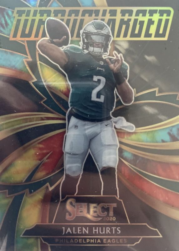 The Jalen Hurts 2020 Select #25 Turbocharged - Tie-Dye /25 Rookie card in Raw condition has not changed in price in the last 30 days and was last sold for $121.00 .