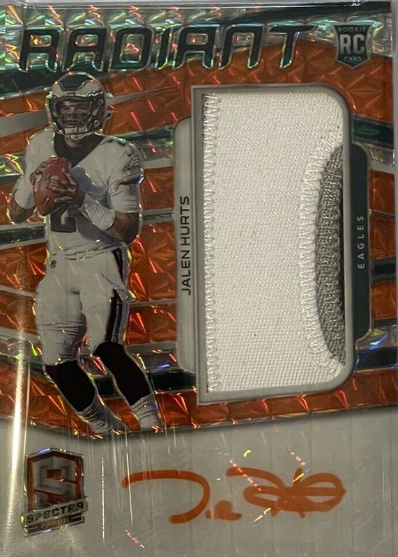 The Jalen Hurts 2020 Spectra #6 Radiant Rookie Patch Signatures - Neon Orange (/15) card in Raw condition has not changed in price in the last 30 days and was last sold for $425.00 .
