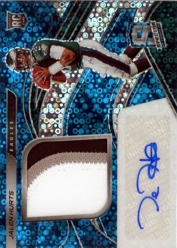 The Jalen Hurts 2020 Spectra #211 Rookie Patch Auto - Neon Blue /60 card in Raw condition has not changed in price in the last 30 days and was last sold for $265.00 .