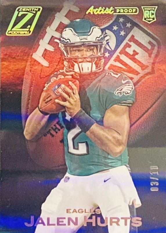 The Jalen Hurts 2020 Zenith #57 Artist Proof Gold /10 Rookie card in Raw condition has not changed in price in the last 30 days and was last sold for $90.00 .