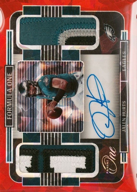 This card is 1 of 7 Jalen Hurts' card variations in the 2021 One set being tracked by Sports Card Investor, including Formula One Autographs (/20), Formula One Autographs - Blue (/15), Formula One Autographs - Bronze (/10), Formula One Autographs - Gold (/5), and Formula One Autographs - Platinum (/3).