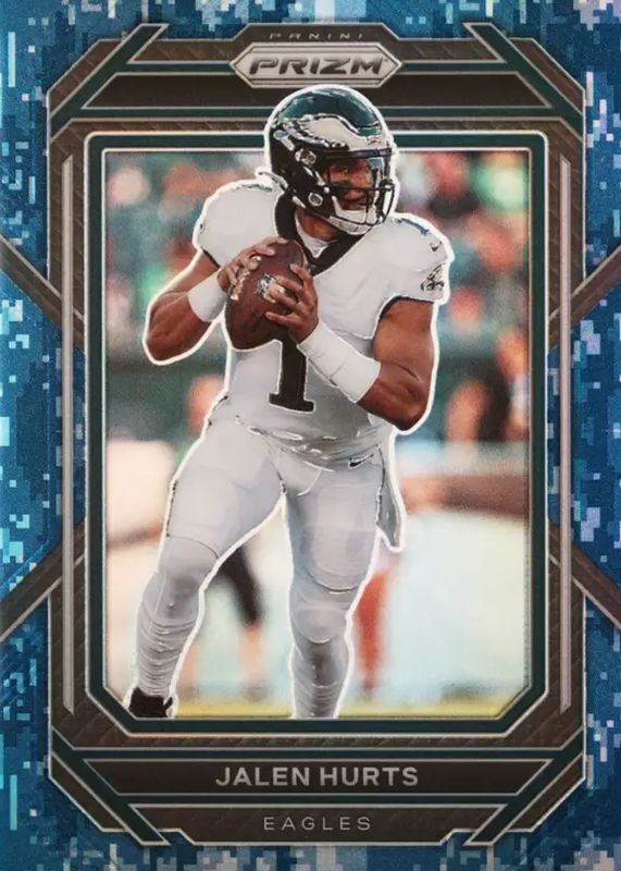 This card is 1 of 49 Jalen Hurts' card variations in the 2022 Prizm set being tracked by Sports Card Investor, including Green Ice, Light Blue, Orange Ice, Silver, and Pandora /400.