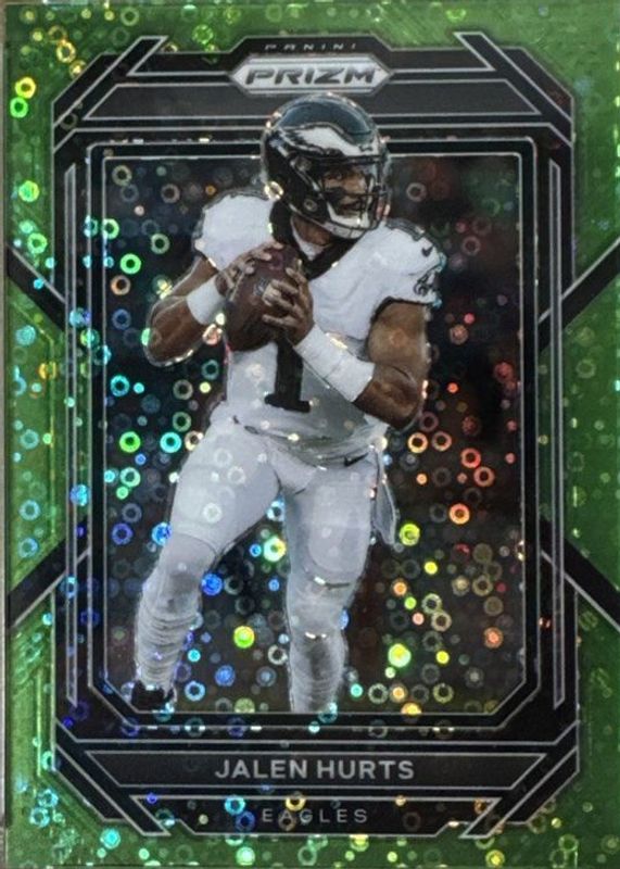 This card is 1 of 49 Jalen Hurts' card variations in the 2022 Prizm set being tracked by Sports Card Investor, including Green Ice, Light Blue, Orange Ice, Silver, and Pandora /400.