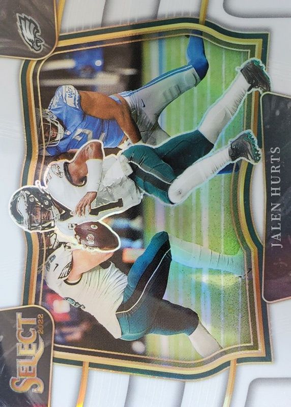 This card is 1 of 153 Jalen Hurts' card variations in the 2022 Select set being tracked by Sports Card Investor, including Field Level Silver, Suite Level Disco, Suite Level Silver, Club Level Neon Green Die-Cut /299, and Club Level Orange Die-Cut /199.