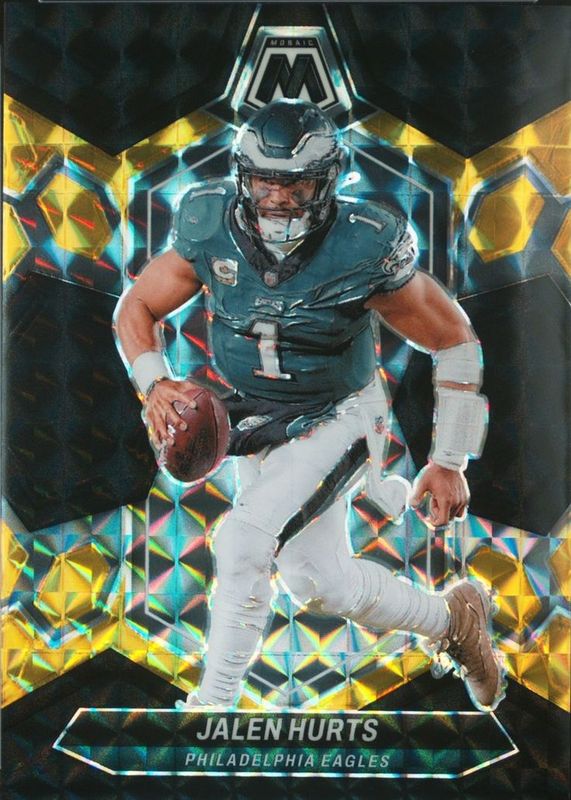 This card is 1 of 26 Jalen Hurts' card variations in the 2024 Mosaic set being tracked by Sports Card Investor, including Choice Peacock /(SSP), Genesis /(SSP), Honeycomb /(SSP), Red Sparkle /(SSP), and White Sparkle /(SSP).