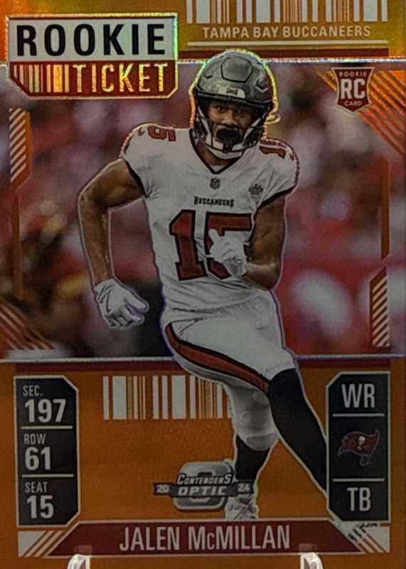 The Jalen McMillan 2024 Contenders Optic #72 Orange /75 Rookie card in Raw condition has not changed in price in the last 30 days and was last sold for $9.29 .