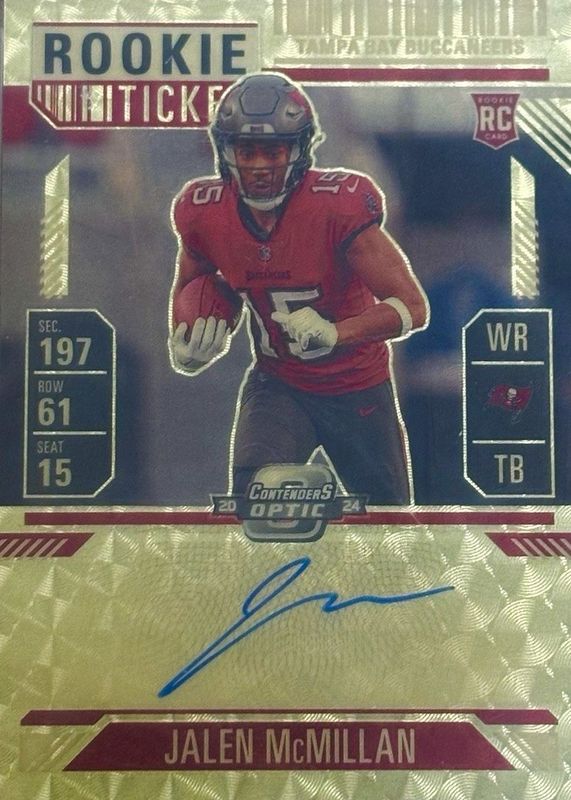 The Jalen McMillan 2024 Contenders Optic #131 Rookie Ticket Auto - Gold Vinyl /1 card in Raw condition has not changed in price in the last 30 days and was last sold for $475.00 .
