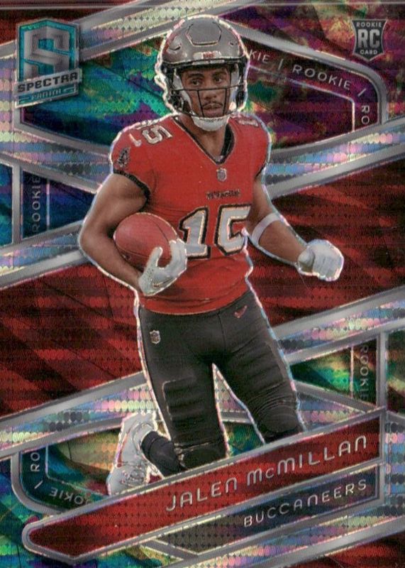 This card is 1 of 19 Jalen McMillan's card variations in the 2024 Spectra set being tracked by Sports Card Investor, including Base, Silver, Hyper /75, Interstellar /60, and Neon Blue Die-Cut /50.
