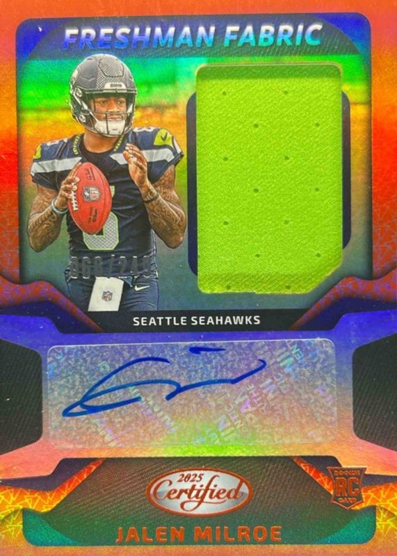 The Jalen Milroe 2025 Certified #FBC-JME Freshman Fabric Signatures - Mirror Orange /249 Rookie card in Raw condition has not changed in price in the last 30 days and was last sold for $15.00 .