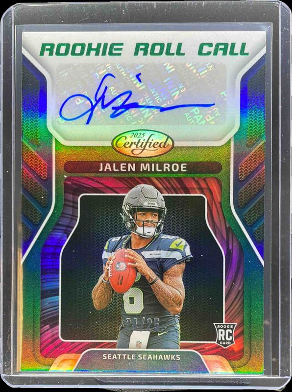 The Jalen Milroe 2025 Certified #RRC-JME Rookie Roll Call Signatures - Mirror Green /25 card is 1 of 99 Jalen Milroe's card variations in the 2025 Certified set being tracked by Sports Card Investor, including Base Rookie /499, Mirror /399, Mirror Purple /299, Mirror Pink /225, and Mirror Orange /150.