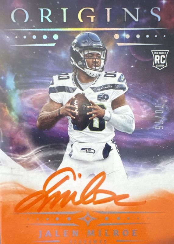 The Jalen Milroe 2025 Origins #RA-JMI Rookie Autographs - Orange /75 card in Raw condition has not changed in price in the last 30 days and was last sold for $48.00 .