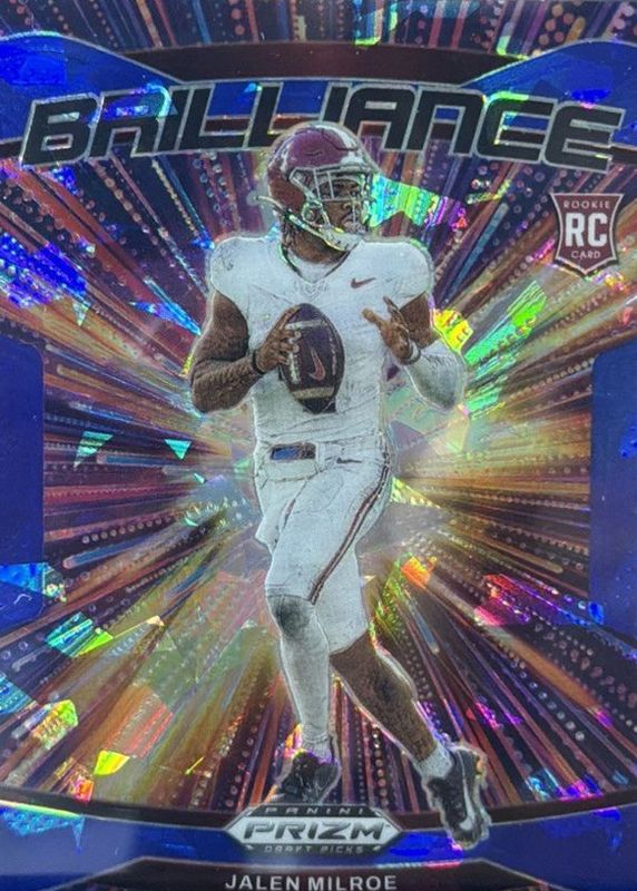 The Jalen Milroe 2025 Prizm Draft Picks #9 Brilliance - Blue Ice /149 Rookie card in Raw condition has moved up $0.99 (+24.8%) in the last 30 days and was last sold for $4.99 .