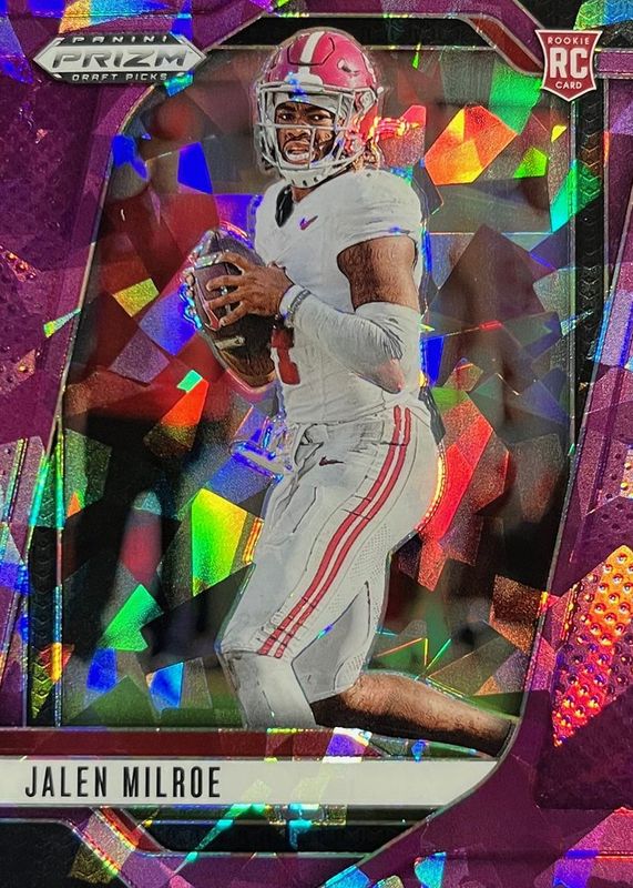 The Jalen Milroe 2025 Prizm Draft Picks #5 Purple Ice /199 Rookie card in Raw condition has not changed in price in the last 30 days and was last sold for $2.50 .